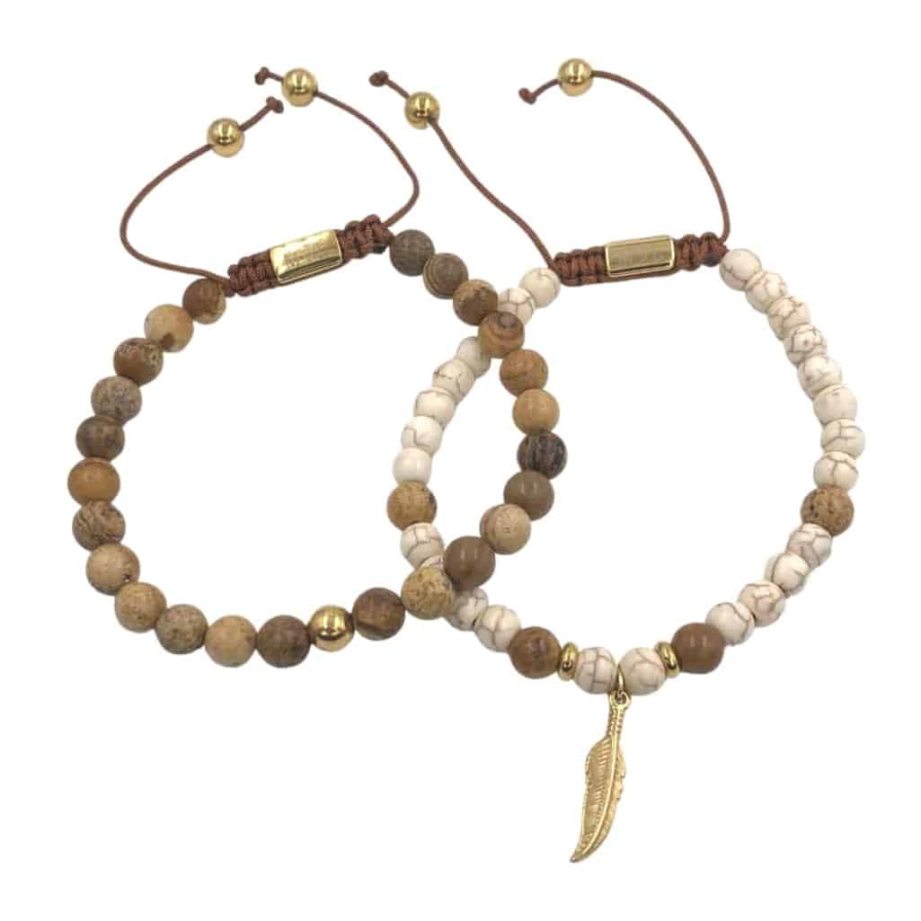 סט צמידים מיוחד מבית מיסטר לקס, הסט כולל שני צמידים בגוונים של חום וחום בהיר ועם תליון נוצה עדין ויפה. להשלמת הסטייל הצמידים מושחלים בשרוך מיוחד ואיכותי בצבע חום.