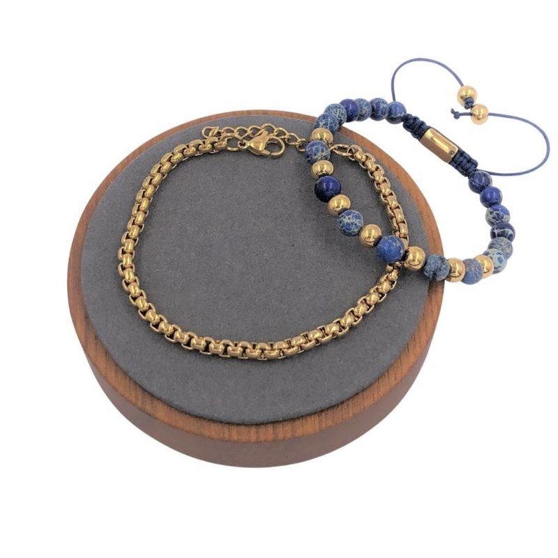 צמידים לגבר – סט צמידים מיוחד לגבר הכולל צמיד אבני חן כחולות בשילוב חרוזי זהב מפלדת אל חלד וצמיד גורמט עדין מפלדת אל חלד