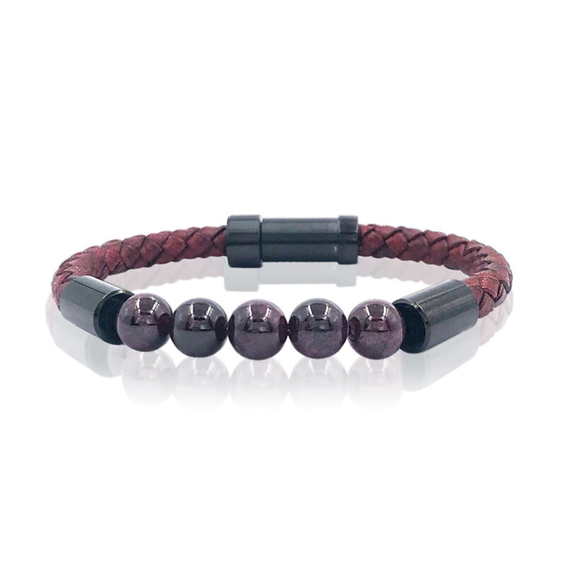 צמיד לגבר – עור וחרוזים בורדו-שחור