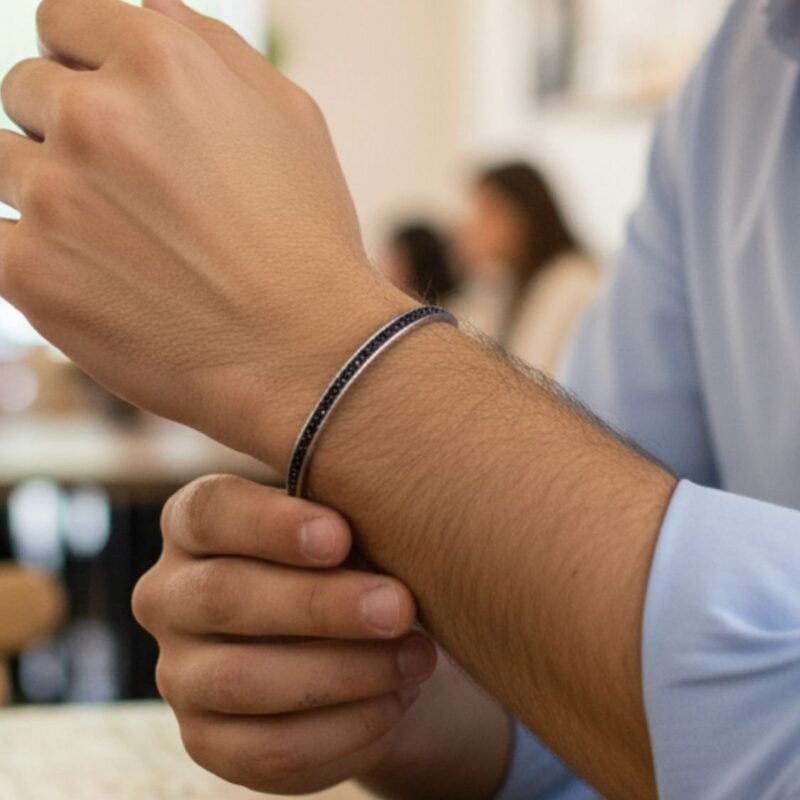 צמיד קשיח לגבר – מפלדת אל חלד איכותית בשילוב אבני זירקון שחורות. צמיד עדין וקלאסי, באיכות הגבוהה ביותר ובמחיר מיוחד!