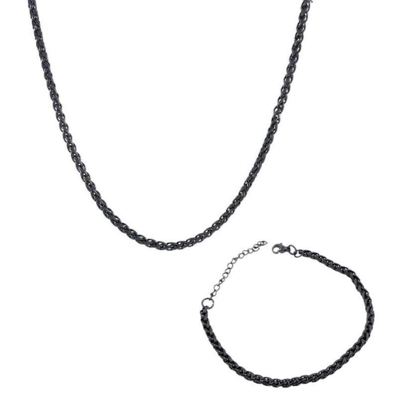 סט צמיד ושרשרת בסגנון צמה עשויים מפלדת אל חלד בציפוי שחור, עכשיו במחיר מיוחד